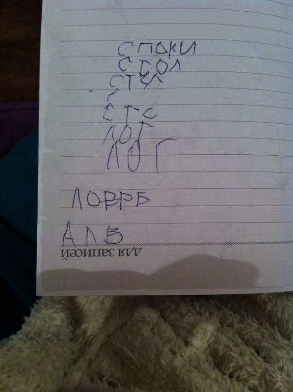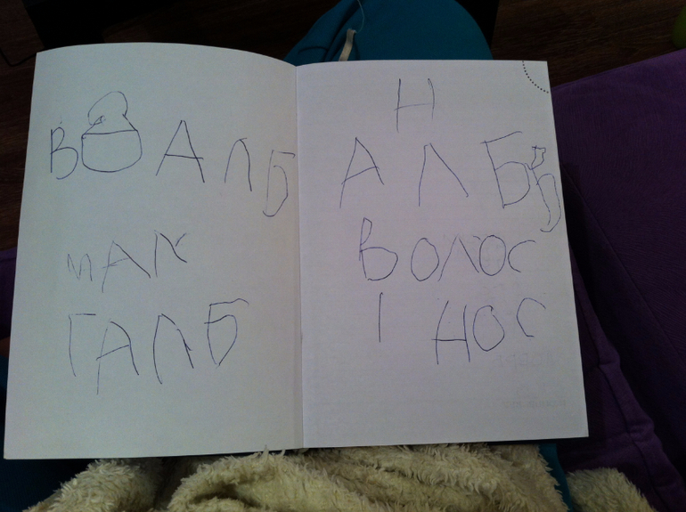 По своей инициативе доча просто решила писать буквы, потом читать, что написала, ну а потом и по мод мою диктовку писать