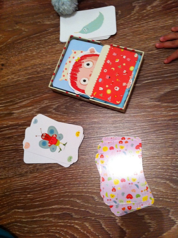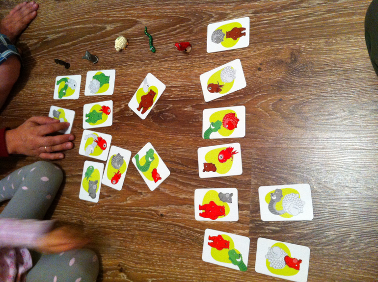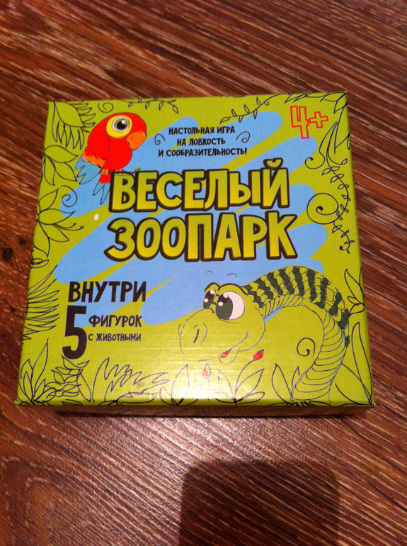 Динамичная игра от ЛасИграс "Веселый зоопарк". Приобрести можно в СимаЛенд вот здесь. Игра на внимательность: нужно схватить фигурку, изображенную на картинке в правильном цвете либо фигурку, которой нет на картинке, если изображенные на картинке звери все неправильного цвета. Мы играем пока только с карточками, где есть правильного цвета фигурки