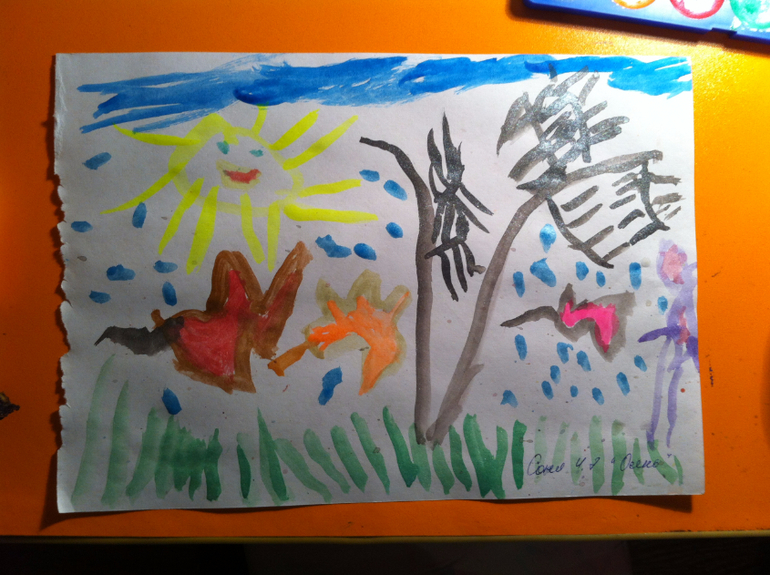 Рисовали осень... Каждый свою...Это Сонечкина ... Розовые и оранжевые - это падающие листья...
