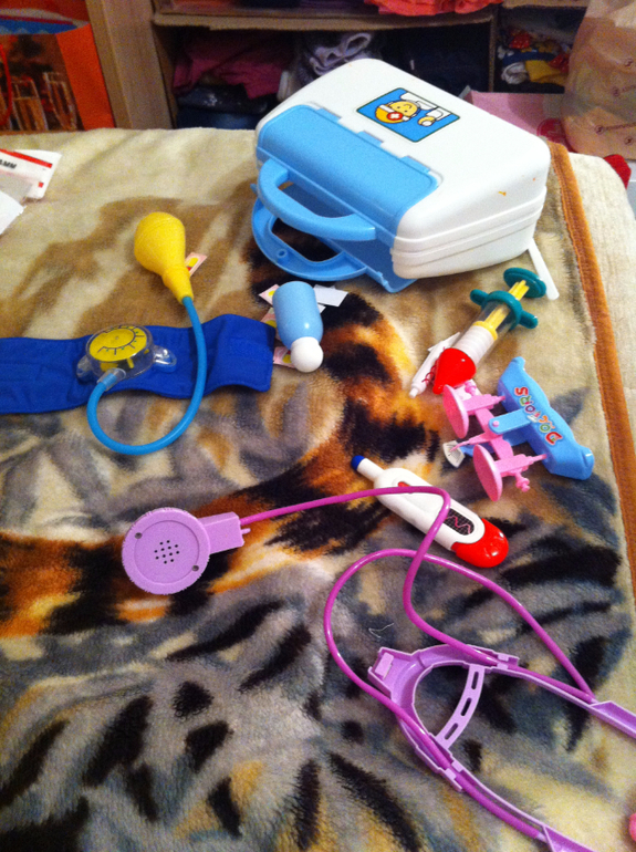 Потом как то плавно перешли к игре в доктора. Вернее дочка начала, а я уже подхватила и постаралась из игры выжать развивающий потенциал. Сначала просто полечили маму, зверей
