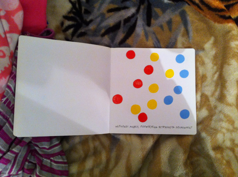 Регулярно дочка достает эту книгу и просит "поколдовать". Мне если честно она кажется совсем глупой, я ее не понимаю, как не понимаю и отзывов, типа взрослые от души посмеялись и повеселились. Мне она таковой не кажется, но вот ребенку нравится, видимо для нее это действительно волшебство... нажми на кружок, потри, потряси, переверни страницу и посмотри что получилось. Дите все это делает с превеликим удовольствием. Ну есть небольшой познавательный момент, типа понятия "левый" (потри кружок "слева"), "правый", цвета, последовательность, величина.