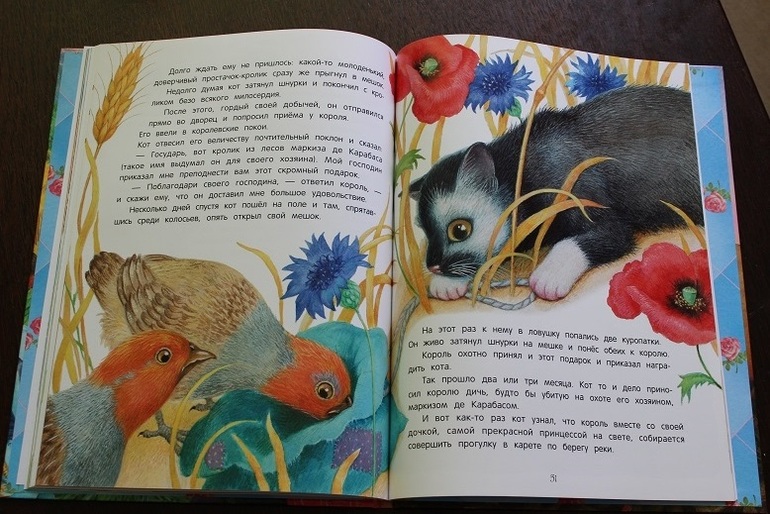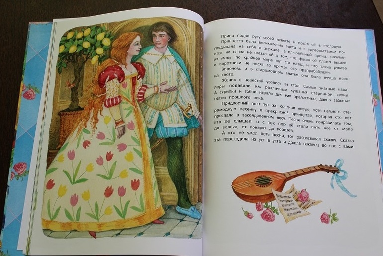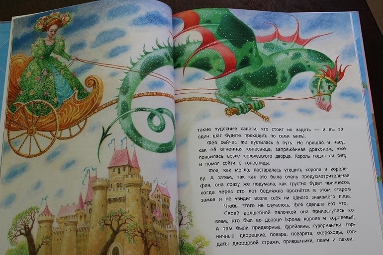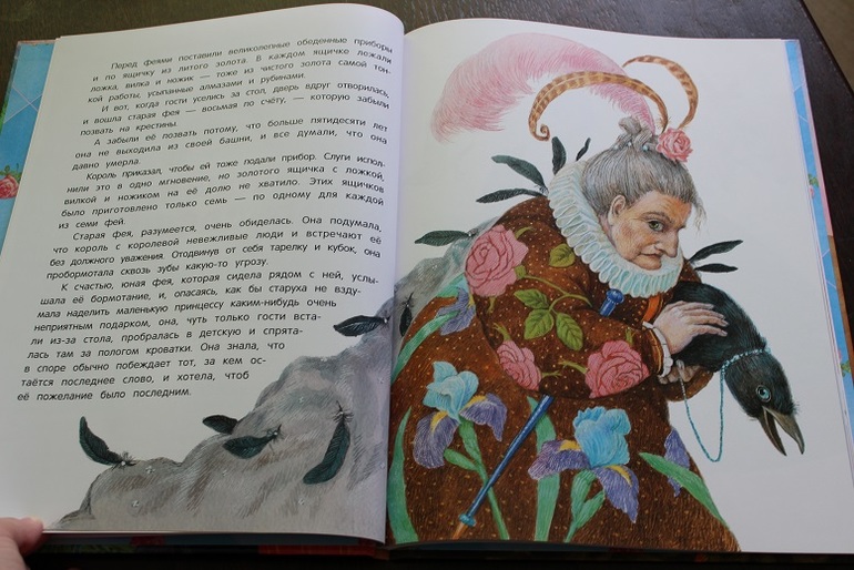 Я не очень-то люблю, когда картинки перелиты цветом, когда художник использовал всю палитру от А до Я, но здесь - такой удачный компромисс, что даже я умолкаю. Богатство красок - лишь начало списка прелестей издания от Лабиринт-Пресс. Большой формат (даже не А 4), обложка, сочетающая в себе мягкость карандашного рисунка и глянец тиснения. Смесь нежности и пафоса, скромности и праздничности, солидной подарочности - как сами сказки Шарля Перро.