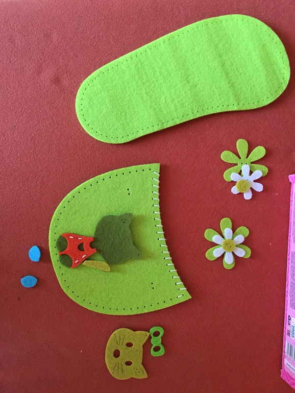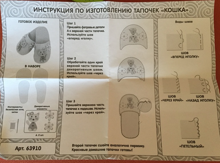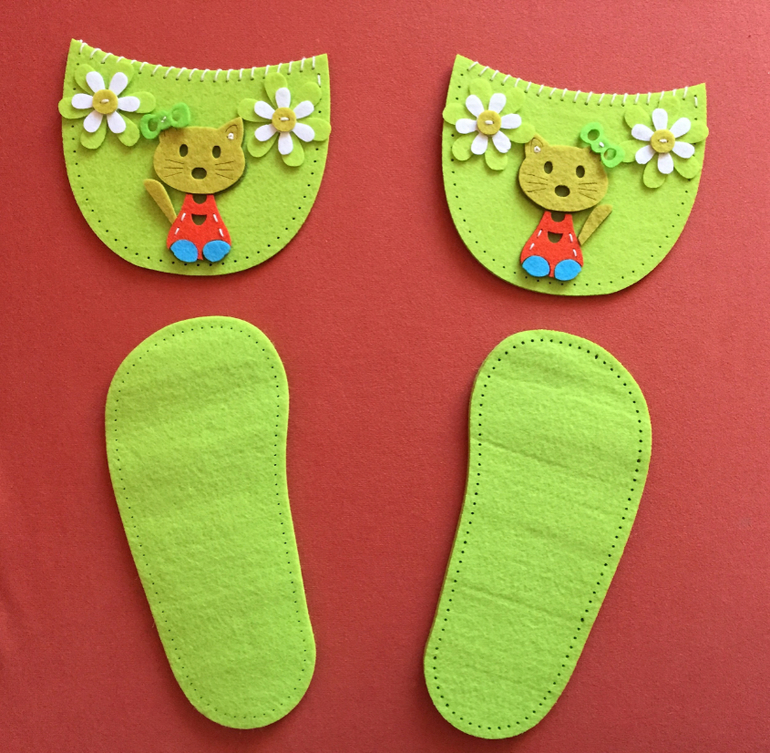 Я купила этот набор, втайне надеясь, что дочка будет с удовольствием в этих тапочках ходить, ведь, во-первых, они с кошками! А во-вторых, и в главных, она их сама шила!