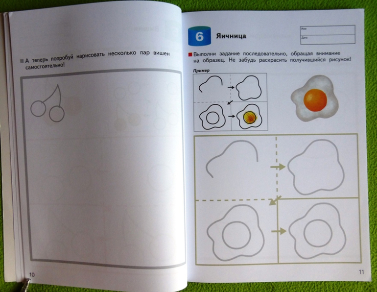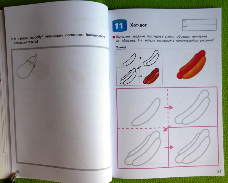 В тетради представлены знакомые ребенку предметы: игрушки, животные, фрукты, посуда и пр. Во время работы, ребенок будет проводить прямые и ломаные линии, рисовать простые и сложные фигуры, закрашивать фон и наносить рисунок. От страницы к странице задания будут усложняться, а навыки ребенка совершенствоваться, поэтому очень важно выполнять задания из тетради по порядку.