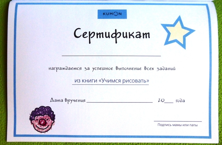 В конце тетради страничка с Сертификатом, который выдается папой или мамой малышу за успешное выполнение всех заданий.