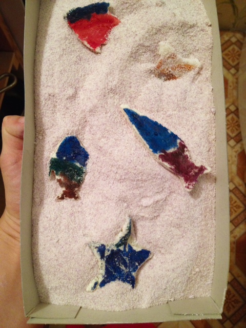 Мы очень любим сенсорные игры - насыпали крашенную гуашью манку в коробку и запускали туда рыбок, сделанных из солёного теста и раскрашенных тоже гуашью.