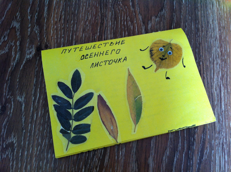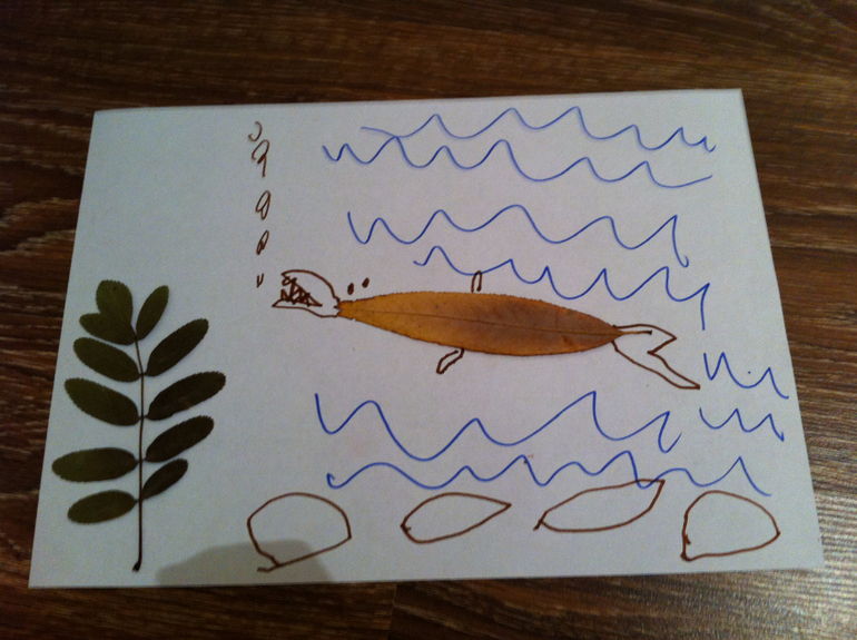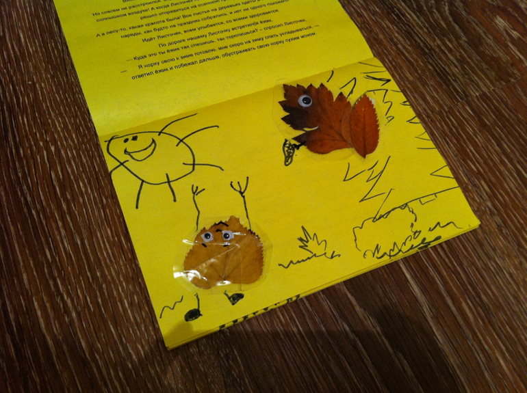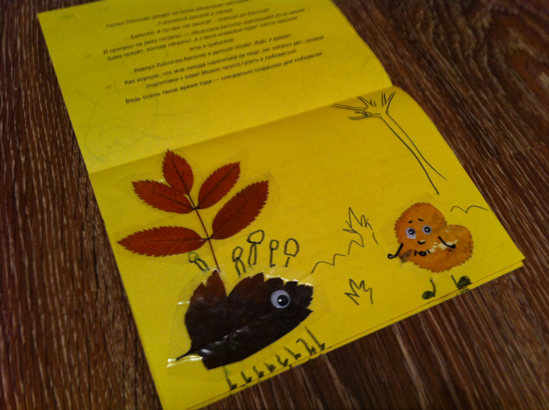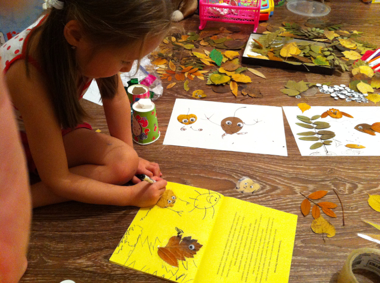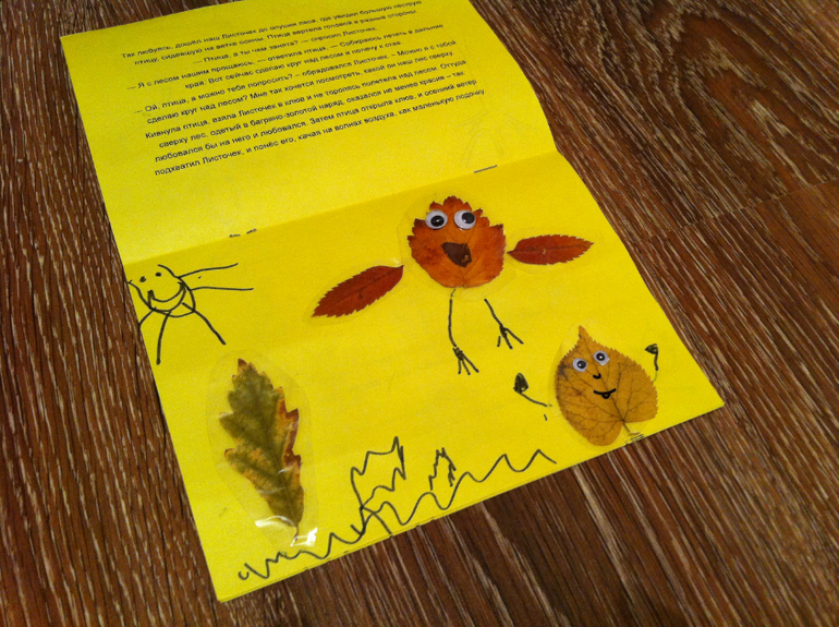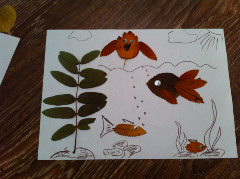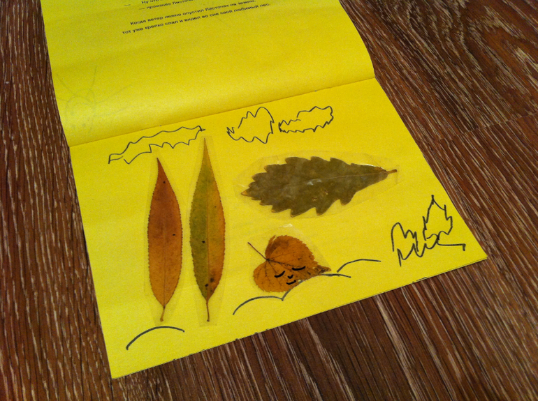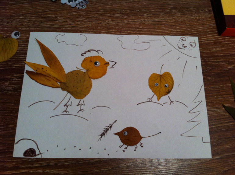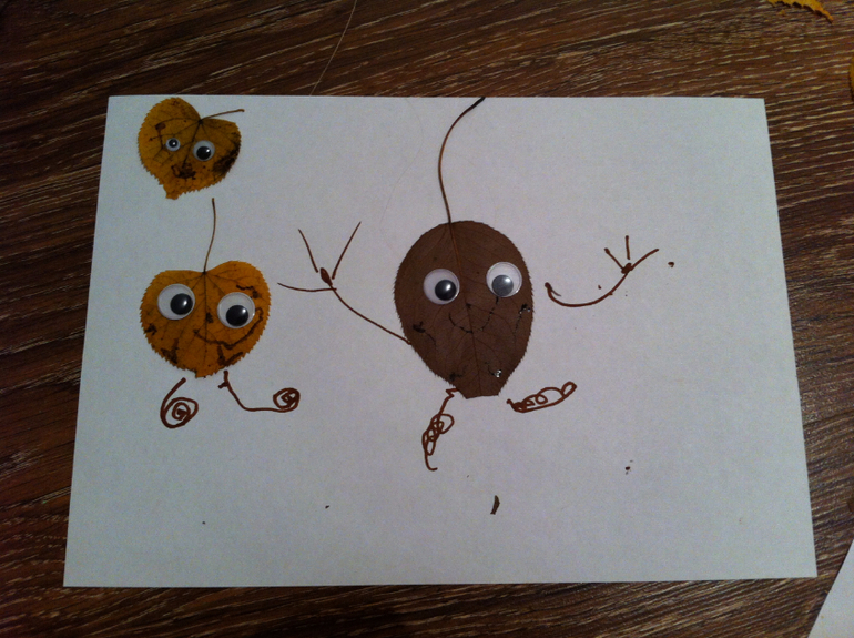 Сначала создавали вот такие картинки из сухих листьев, просто раскладывали на белом листе и дополняли фломастером, придавая картине сюжет. Это мои творения....