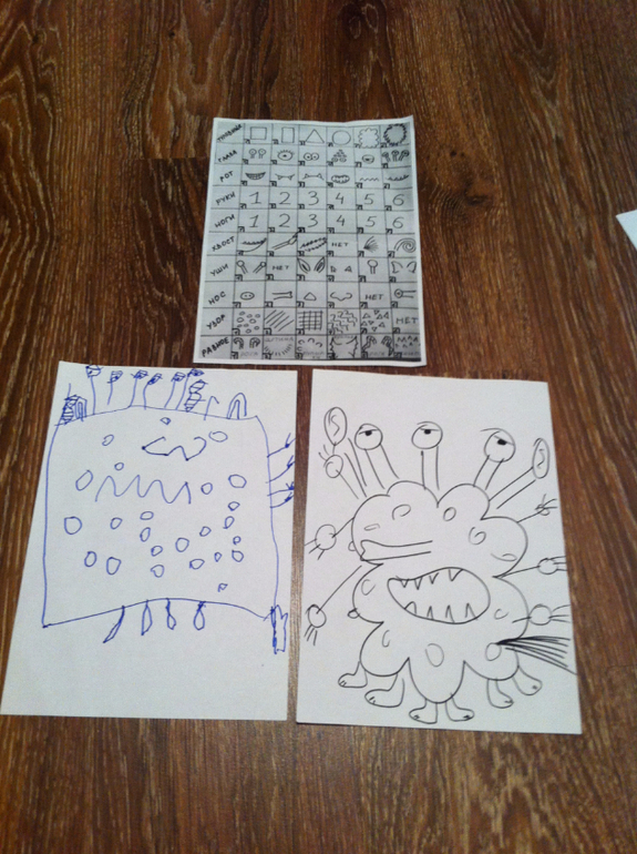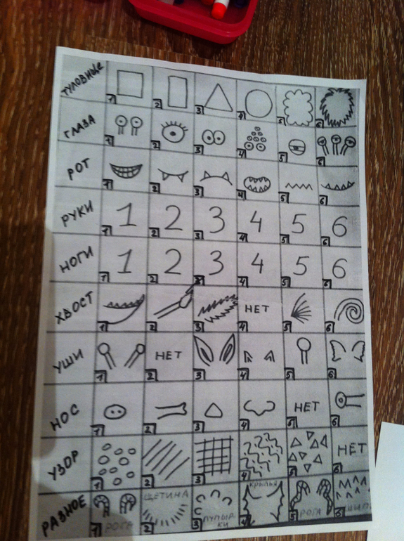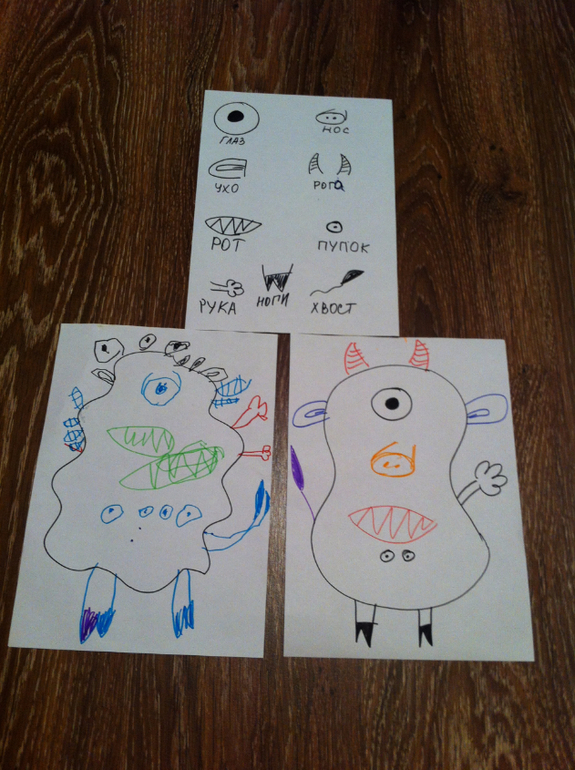 Рисуем монстриков. С помощью кубика определяем какую часть тела рисуем. Идея не моя, слизала откуда то из ББ.