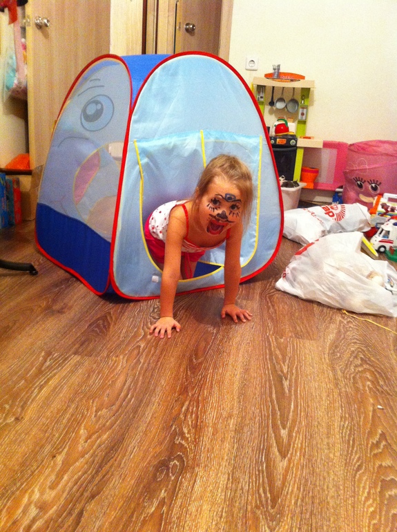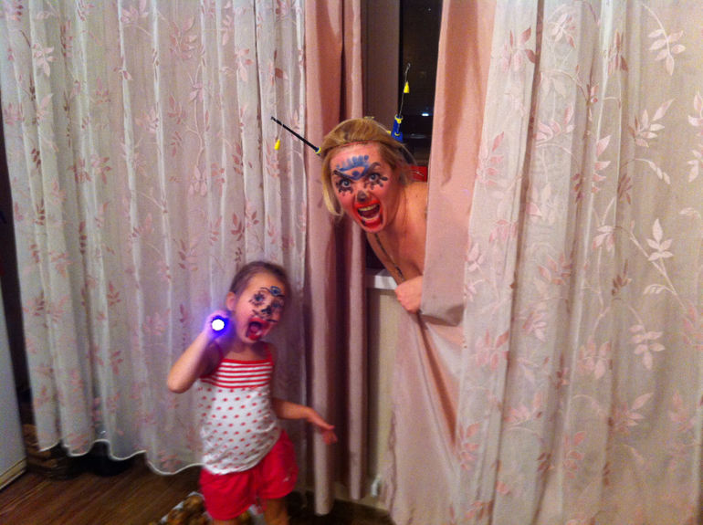 Потом по Сониной традиции мы перевоплотились в этих самых монстров. Реакция ребенка на мамино перевоплощение была неподражаема: "Мама,мама.... и меня также надо разукрасить, аааааа хочу также!" И вот два монстра носились весь вечер по квартире.