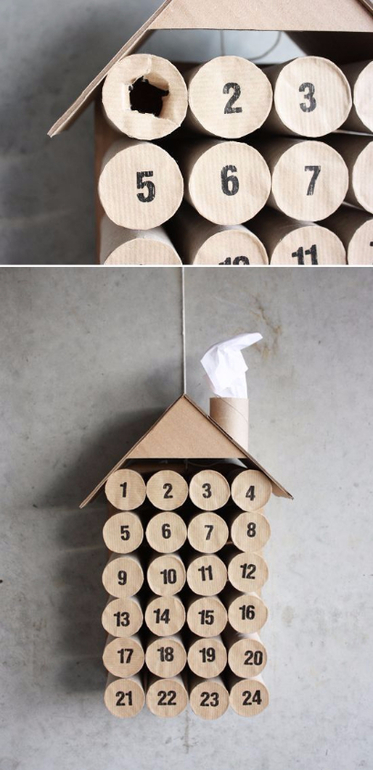 В наших магазинах найти такие емкости не всегла легко, но из этого есть простой выход! Покупаем несколько упаковок бумажных стаканов, украшаем, наполняем их подготовленными подарками и делаем из папиросной бумаги крышки. Один-два вечера, и у вас готов замечательный адвент-календарь!