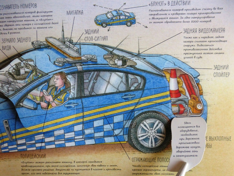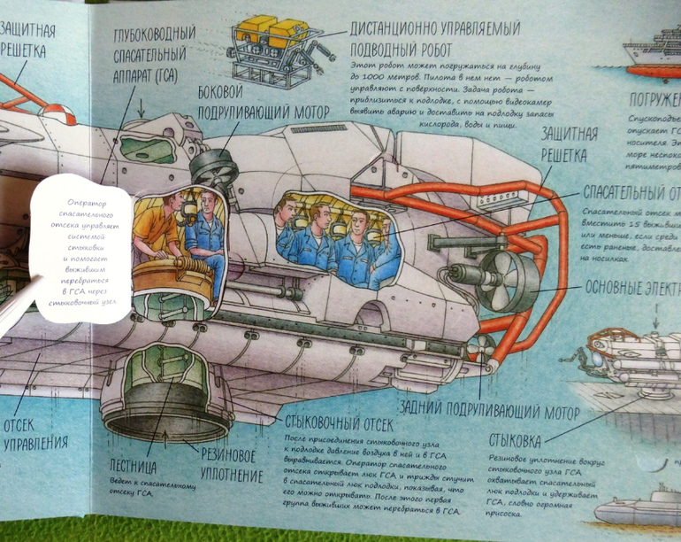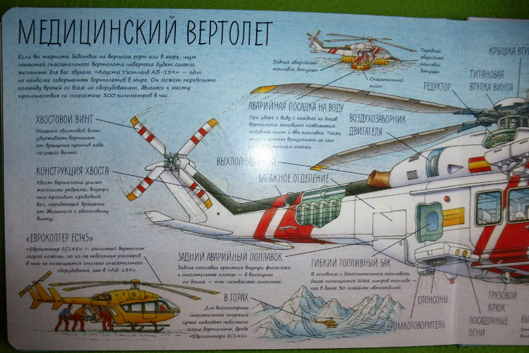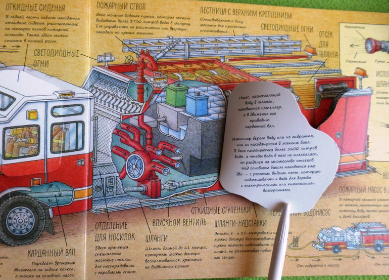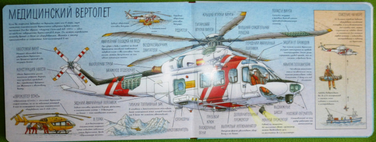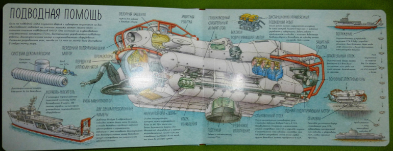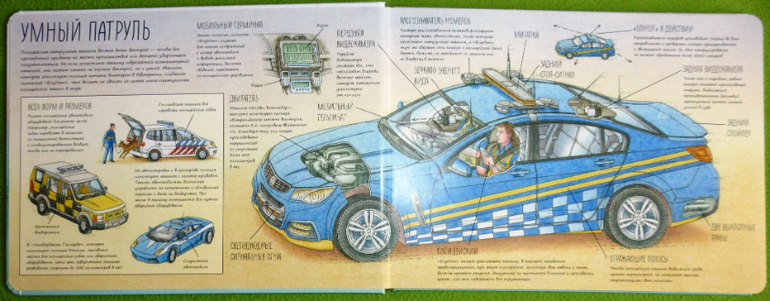 Книга по дизайну аналогична книге «Гигантский транспорт», такой же крупный формат, плотный картон, в книге 8 разворотов, на каждом развороте рассматривается по одному виду техники, много окошек, где можно увидеть технику в разрезе, посмотреть ее устройство внутри. Также, достаточно много информации, каждый элемент конструкции подписан, много интересных и познавательных фактов!
