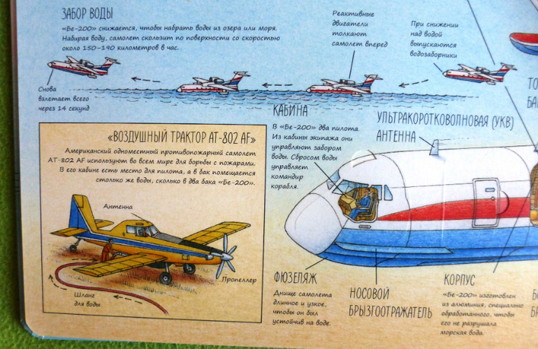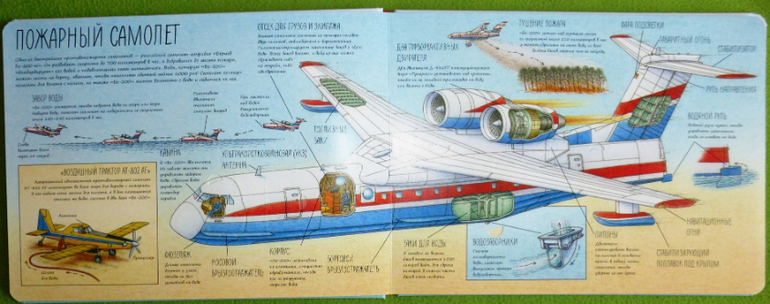 Было приятно читать, что это российский самолет! Российский самолет-амфибия «Бериев Бе-200 чс». Этот самолет может взлетать не только с взлетной полосы, но и с воды и садиться на нее. Здесь самолет рассмотрен в подробнейших деталях, полностью изображен цикл заправки самолета новой партией воды для тушения объекта, можно заглянуть в кабину пилотов, в отсек с баками для воды и химикатами для тушения пожара