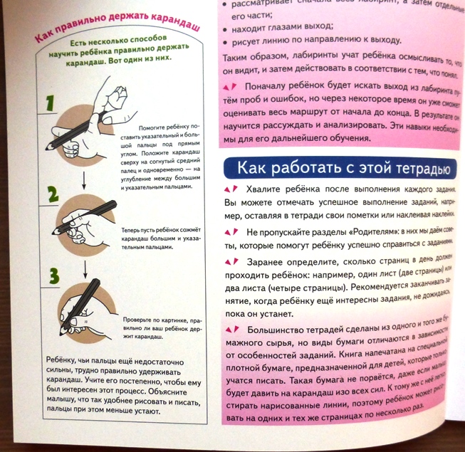 Рабочая тетрадь чуть больше А4 формата, удобно вырезать листы с заданиями, бумага - плотный офсет, можно рисовать как мелками и карандашами, так и фломастерами, на обороте не остается следов, качественная печать и интересные задания. Хоть эта тетрадь ориентирована на детей, которые уже уверенно держат карандаш в руке, бумага в ней подобрана для многократного использования. Такая бумага не порвется, даже если давить на карандаш изо всех сил, нарисованное на ней легко стирается, поэтому ребенок может выполнять задания на страницах многократно, родителям лишь потребуется стирательная резинка, чтобы удалить следы карандаша. Качество издания отличное.