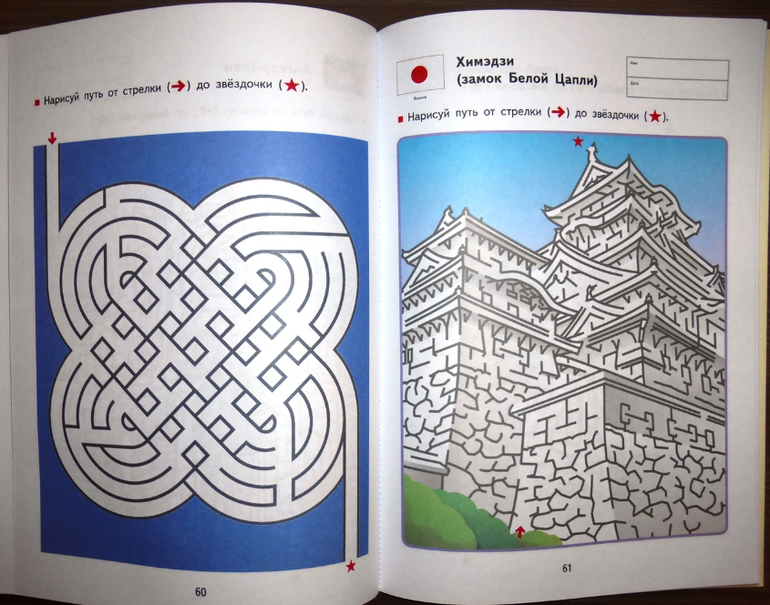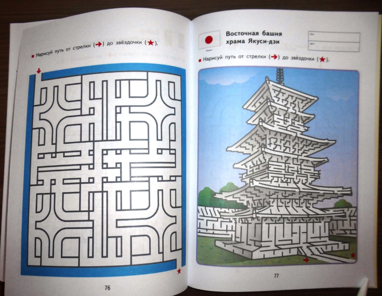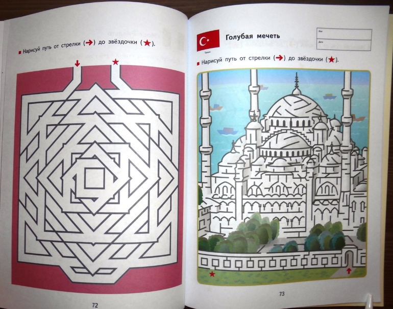 Лабиринты в тетради представлены двух видов. Первый - это одна из известных достопримечательностей мира, второй- в виде абстрактного орнамента, где надо нарисовать путь от стрелки к звездочке.
