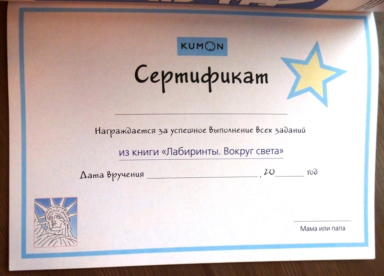 В конце страничка с Сертификатом, который выдается папой или мамой малышу за успешное выполнение всех заданий.