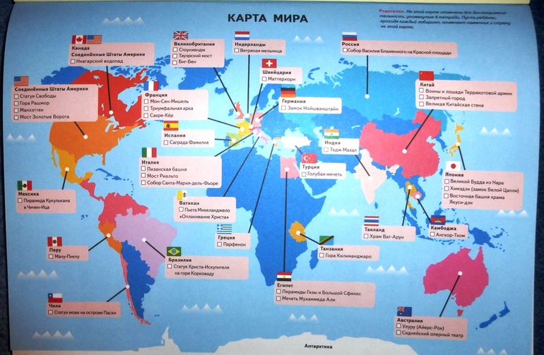 На страничках с заданиями также есть флаг страны, указано название страны и достопримечательности.