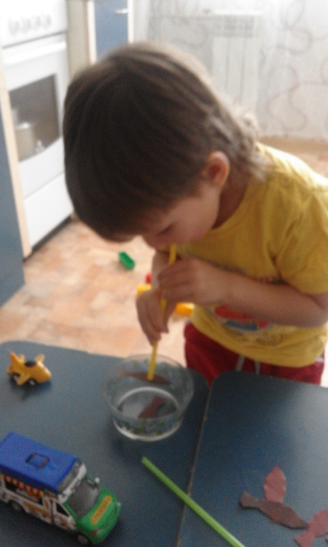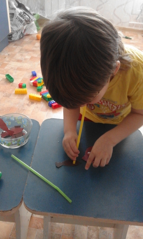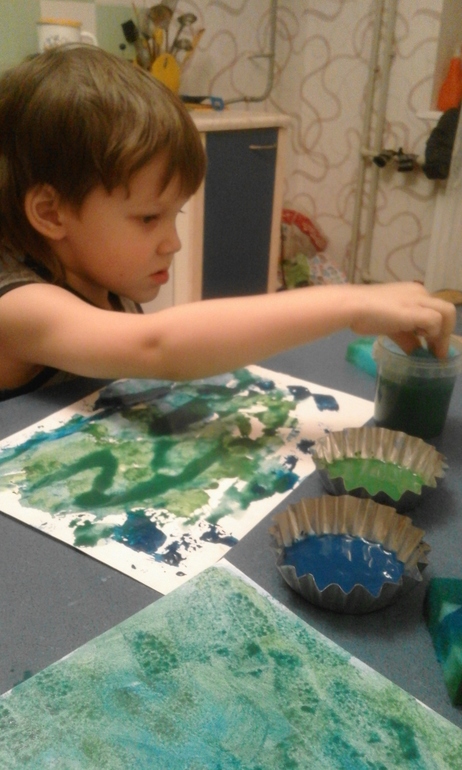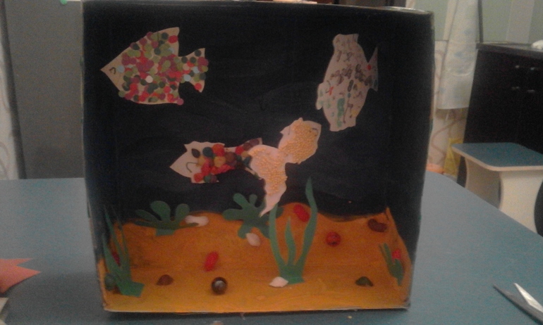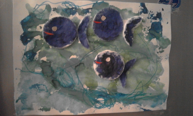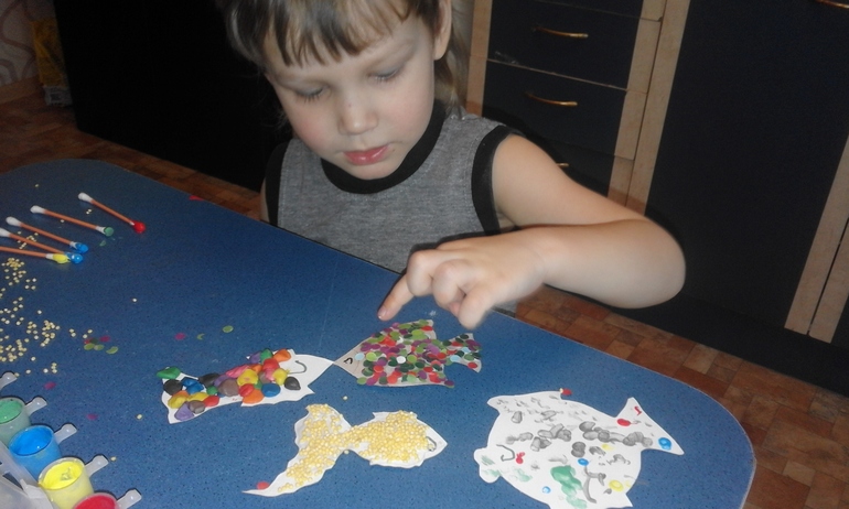А вот рыбки все вышли из-под Святкиной руки. Одна покрыта чешуей из пластилина, вторая из пшена, третья раскрашена гуашью и ватными палочками, а четвертая из конфетти