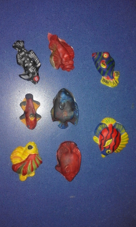рыбки из гипса. Тоже все члены семьи руку приложили. А как перевернуть - не знаю))