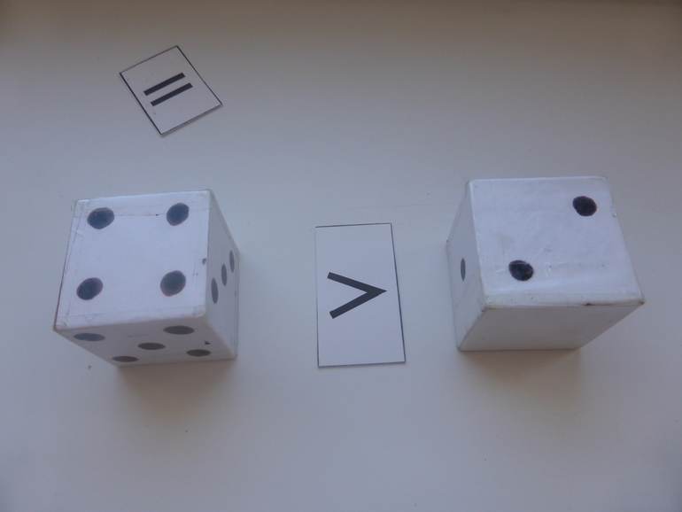 Можно усложнить. Ставим количество (4 фишки) знак < и просим подобрать такое количество, чтобы знак был верный. "Знак показывает, что 4 - меньше, значит с другой стороны знака поставим количество большее."