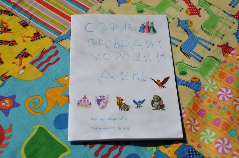 Не удавалось мне понять на сколько дочка понимает текст прочитанного, то она хитро увиливает от расспросов, то я отвлекаюсь. И вот у меня в руках оказывается фантастический инструмент - наклейки. Текст придумался быстро, может немного кривовато, зато предложения простые, исходя из тех картинок, которые были в наборе. Сброшюровала листы, подписала каждую страницу и «на растерзание». Задача Сашеньки проиллюстрировать. Сопровождая рассказом о книгоиздании, о том, как делается переплет, о том, что художник и автор зачастую разные люди, сравнивая разные картинки одних и тех же сказок, книга была готова в считанные минуты. Бонусом мы еще поговорили о названии, и дочка его придумала, оформив обложку.