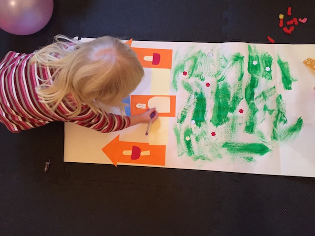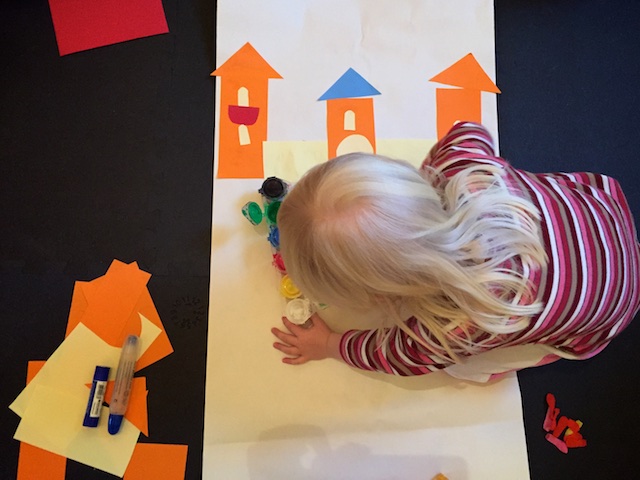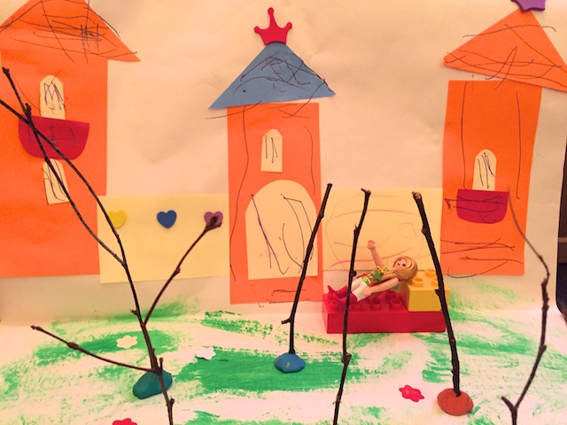 Затем происходит череда событий: Аврора знакомится с принцем, узнает, что она принцесса, отправляется в замок родителей и там Малифисента ее усыпляет. Мы все это быстро показали в театре и принялись за самую масштабную часть этой сказочной игры - изготовление замка. Тут и разные виды аппликации, и рисование большой кистью, и три-Д моделирование))) Я только сделала заготовки из бумаги и помогала устанавливать "деревья".