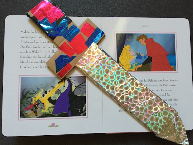 Но и мы с Настей вооружились мечом, на случай, если коварная фея решит заглянуть к нам на огонек. Основу я вырезала из толстого картона, обклеила "лезвие" самоклейкой, а Настя украшала ручку "самоцветами". У меня была идея сделать два меча, чтобы устроить настоящий бой на мечах, но Настя не захотела. Вот что значит, девочка)))