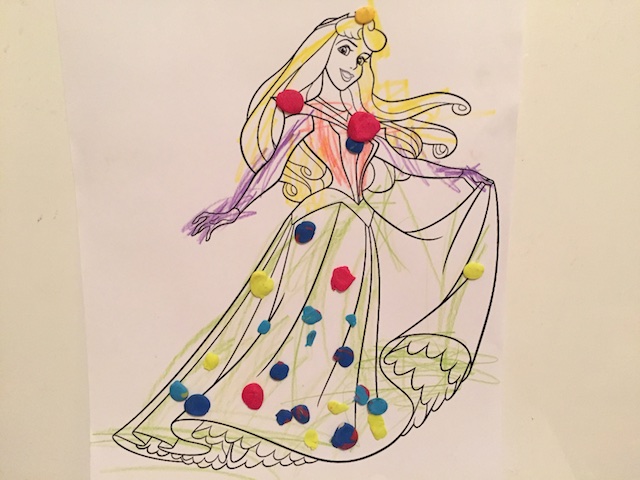 Накануне ее 16 дня рождения феи готовят своей подопечной подарки: нарядное платье и праздничный торт. Мы решили поучаствовать только в изготовлении платья. Настя раскрасила рисунок и украсила все кусочками пластилина.