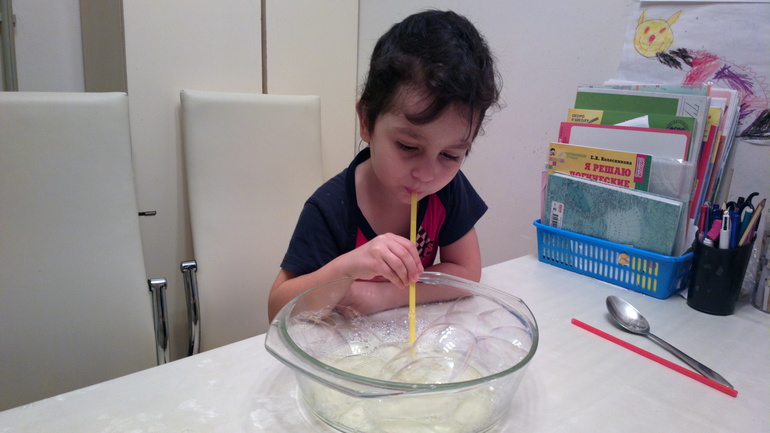 Если надоест выдувать большие пузыри, то можно пофантазировать и сделать рисунок из пузырей. У нас получился вот такой цветочек: