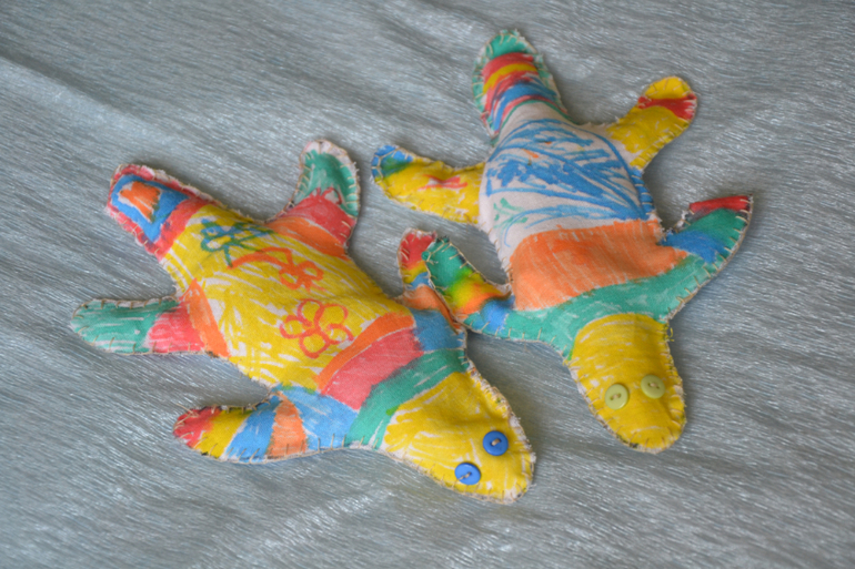 Морские плиозавры из ткани, внутри крупа. Я помогла вырезать и прошить их, дети разрисовывали их специальными маркерами по ткани.
