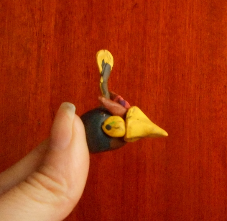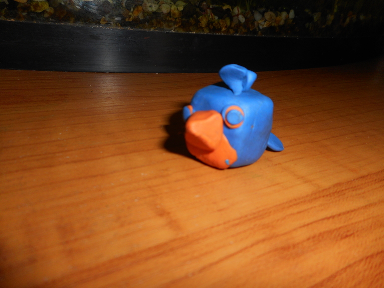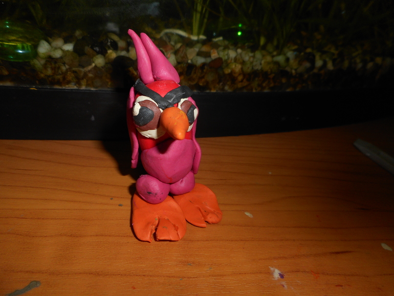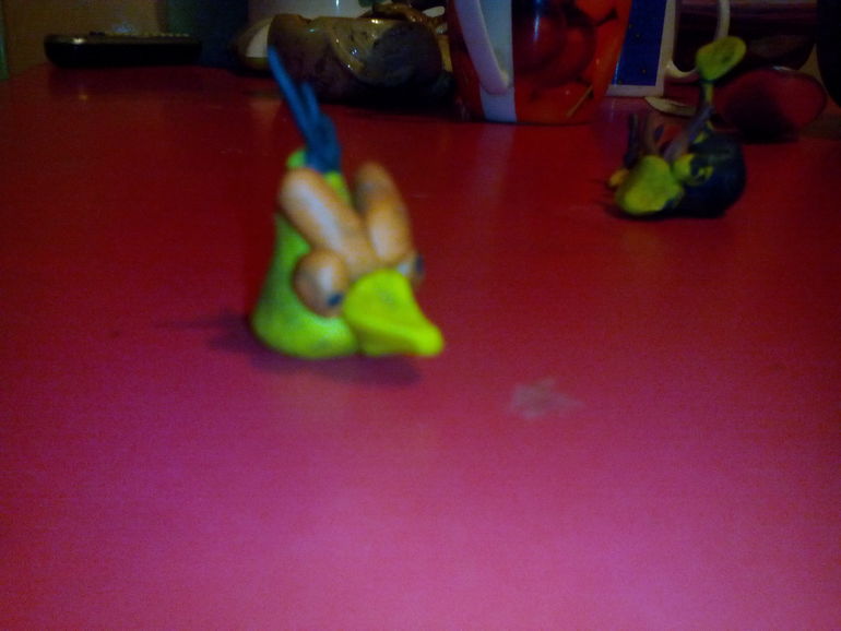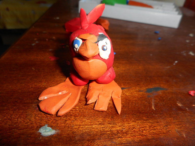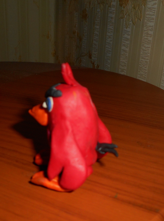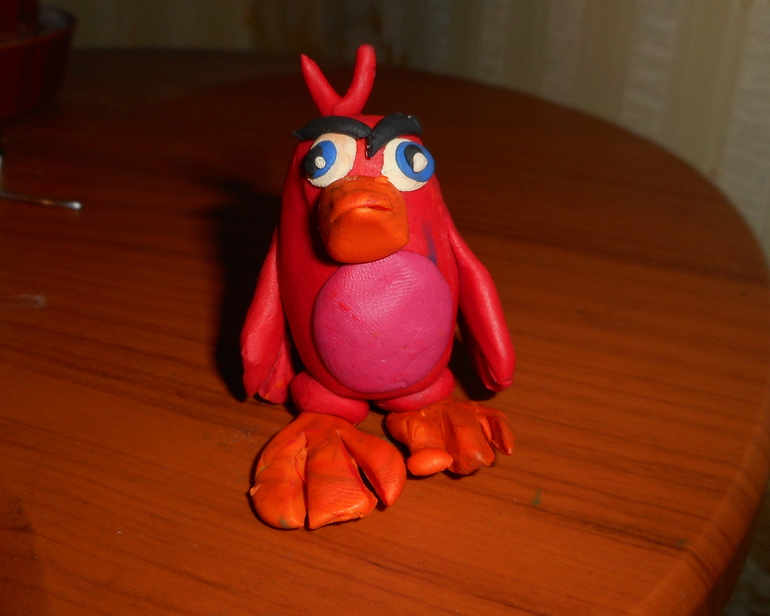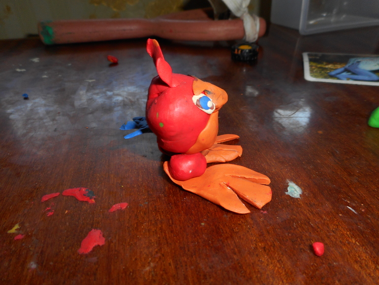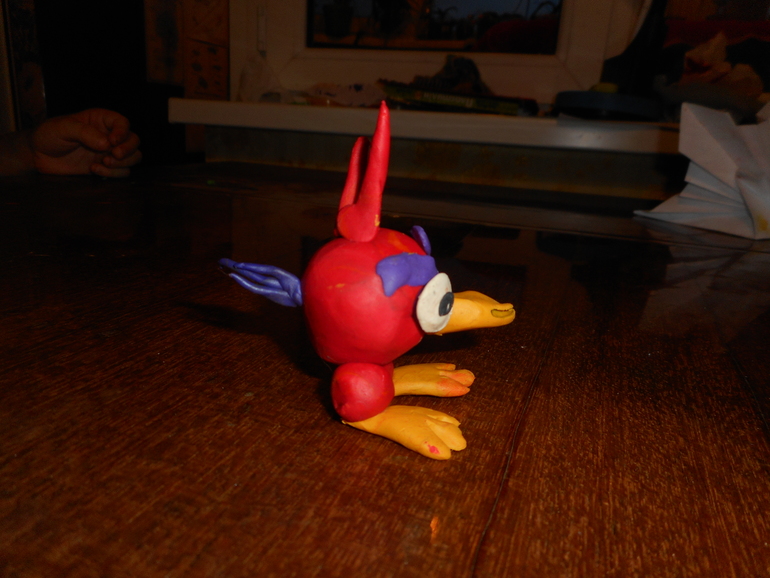Ещё и черное пластилина не было, Кирилл решил использовать сиреневый и больше похоже не на Рэда, а на попугая какого-то.. Я тут только помогла сделать лапки, и то просто придала форму, а стэком Кирилл сам уже резал))))