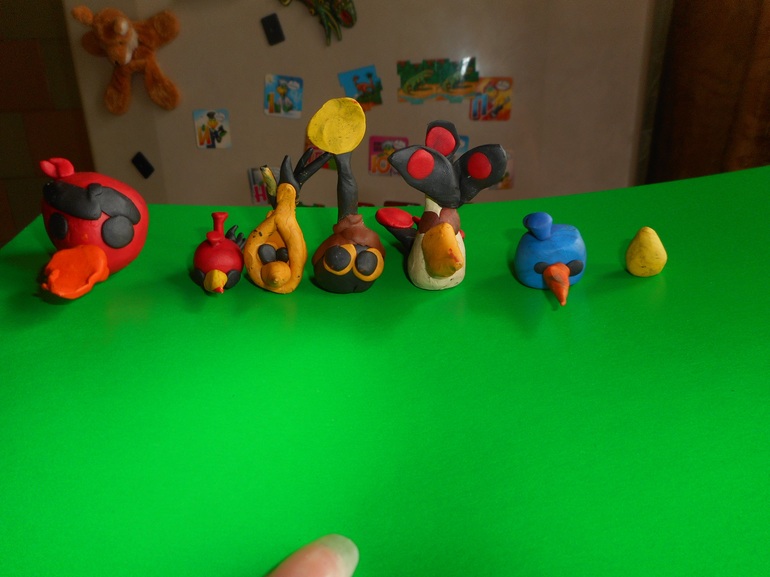 Первый Рэд из angry birds space, потом Матильда, Чак, который упал, Кирилл на него наступил, потом сделал ему новый нос и вуаля))) Потом обычный Рэд, Бомб