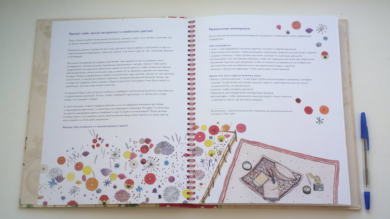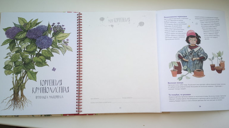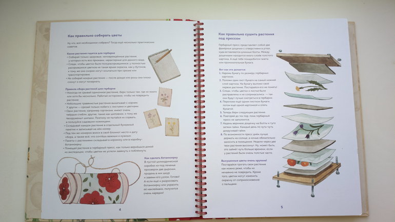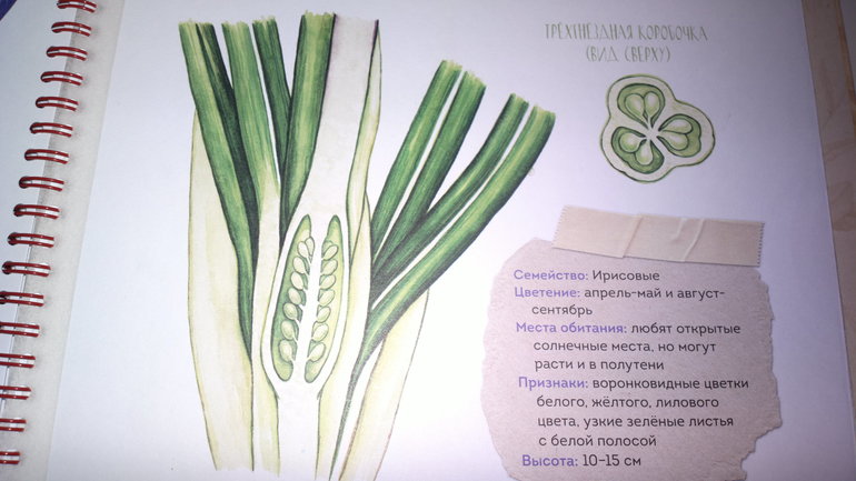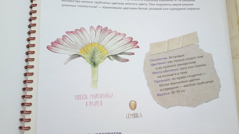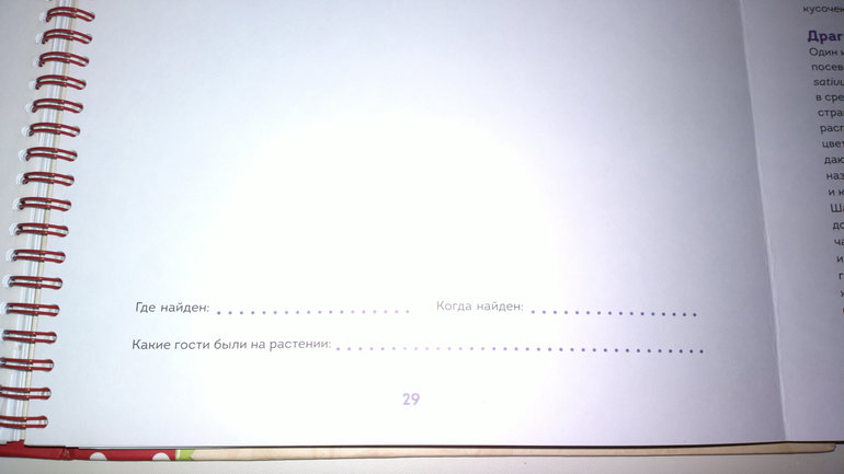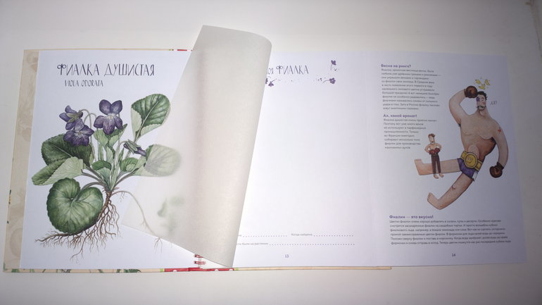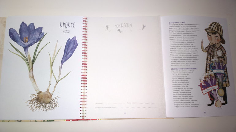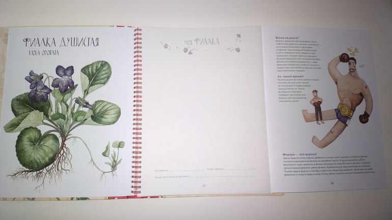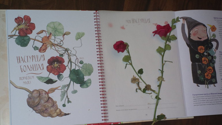* Та страничка, что справа представляет собой клапан, она открывается как секретик и перед нами появляется еще один разворот- это место для хранения сухого растения и страница с интересными фактами о данном растении.