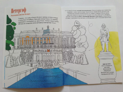 На листах можно найти Нижегородский Кремль, Мамаев курган и скульптура "Родина-мать зовет", озеро Байкал, Петергоф, Троице-Сергиева Лавра, Кижи, Ростовский Кремль, мечеть "Сердце Чечни", Коломенский Кремль, Псковский Кремль.