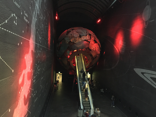 Ну и не могу не поделиться еще одной фотографией. Переход на этаж, посвященный вулканам и землетрясениям, оформлен в виде метеорита, в который посетители въезжают на эскалаторе.