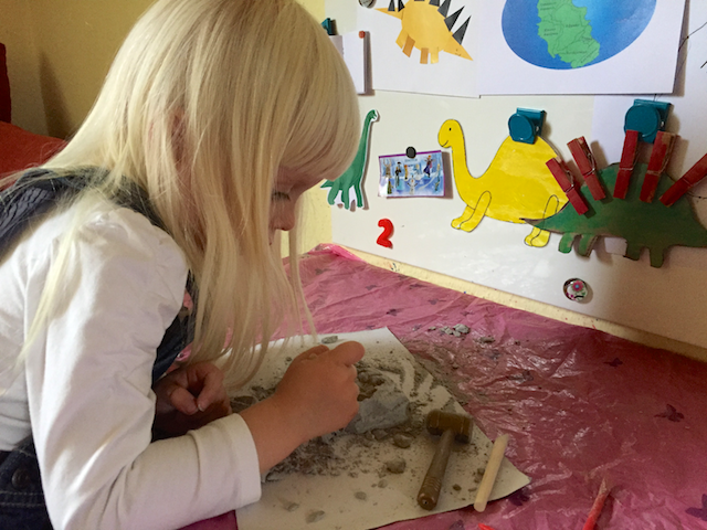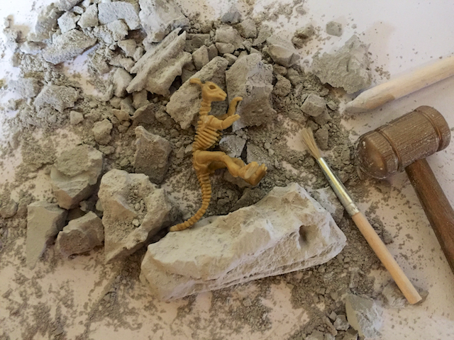 Игра в палеонтолога тоже оказалась настоящим хитом. Я сначала хотела сама сделать кости динозавров из самозастывающей массы и спрятать в песок, но увидела в магазине копеечные готовые наборы. Даже инструменты прилагаются.