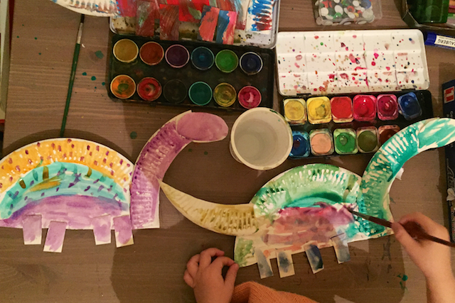Конечно, не обошлось и без поделок. Брахиозавров из бумажных тарелок и в коронах :) уже показала выше.