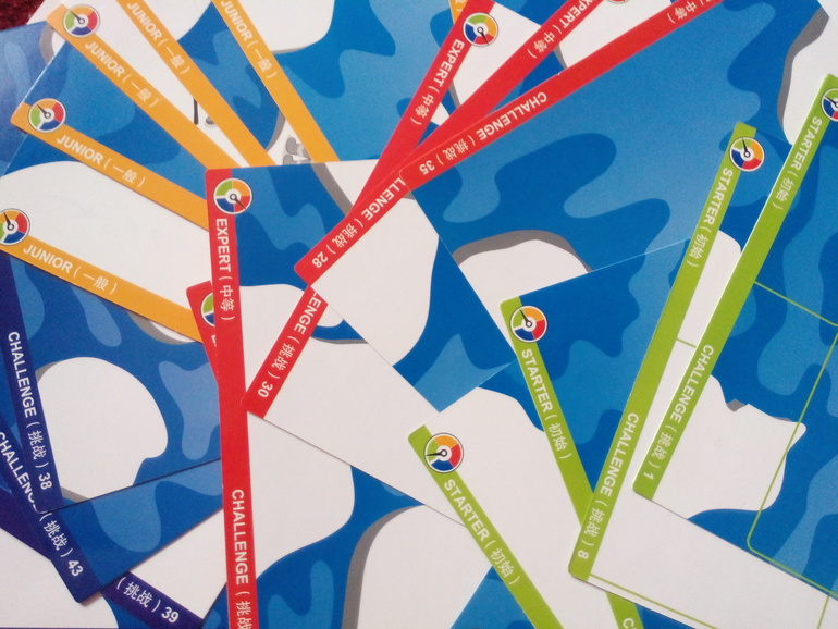 Задания разделяются на четыре уровня сложности. И если на карточках первого уровня сложности даны подсказки (контуры нескольких фишек очерчены зеленым цветом),
