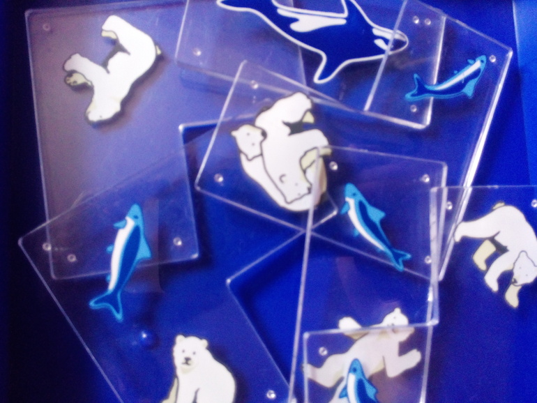 Цель игры - расставить пазлы таким образом, чтобы белые медведи оказались на льдинах, а рыбы в воде. При этом изображения животных и рыб не должны закрывать эскимосов, которые изображены на карточках.