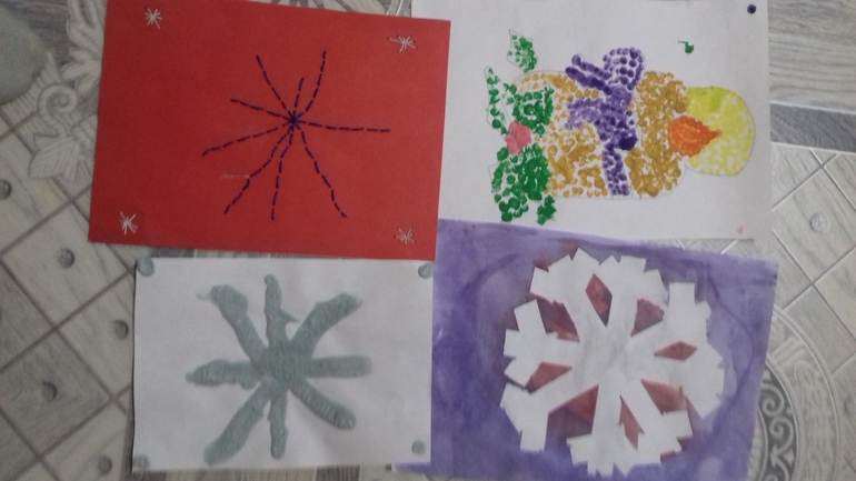 первую открытку делали с помощью изоленты, вторую при помощи жидкого теста, которое запекали. Третью раскрашивали ватными палочками. Четвертую открытку Арина вышивала. Я сделала дырочки, чтоб было ей легче. И еще одну открытку сделала применив технику фронттаж( каждый из нас это проделывал с монеткой). У нас объемный линолеум.
