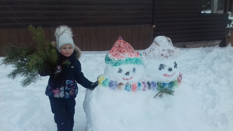 На выходные ездили в деревню и одним из заданий было построить снеговика. Строить она не очень хотела, зато раскрашивала с удовольствием.![]()