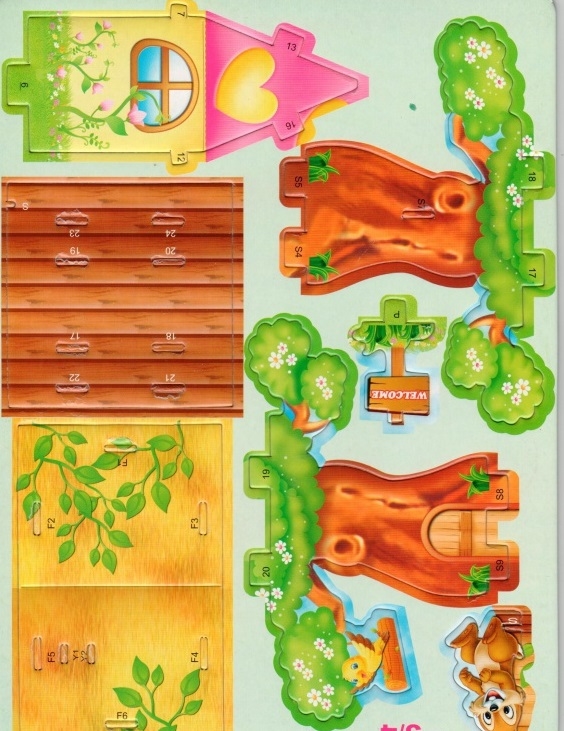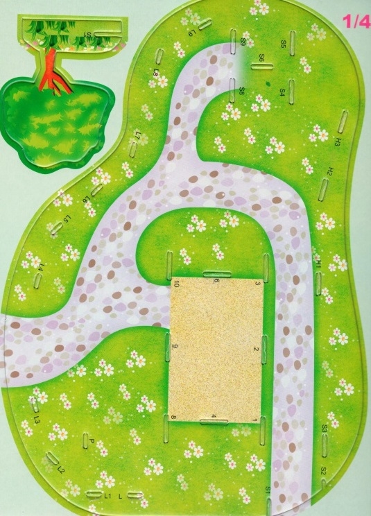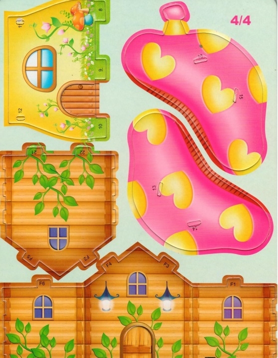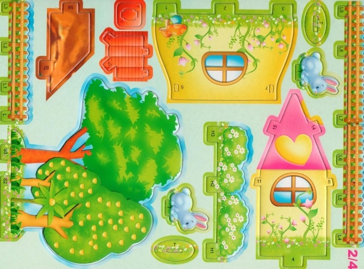 Пазлы в собранном виде небольшие, но очень интересные. Это такие небольшие 3d модельки с домиками или фигурками людей и животных. Размер где-то 25-30 см в длину и в высоту около 15-20 см. На тот момент дочка сама их собрать не могла, но помогала доставать из рамок детальки. В набор входит 4 листа размера А4, из которых нужно выдавливать детальки.