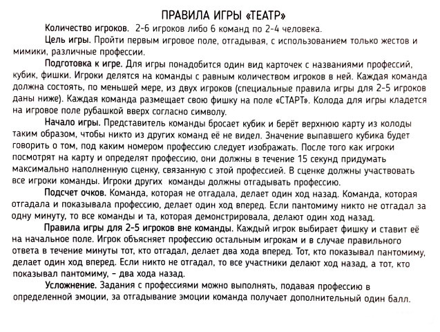 «Театр» (3-12 игроков) возраст 14+. Цель игры - первым пройти на сцену, собрав наибольшее количество очков, соревнуясь в отгадывании и объяснении без слов всевозможных профессий, использовать можно только мимику, жесты и невербальные эмоции.