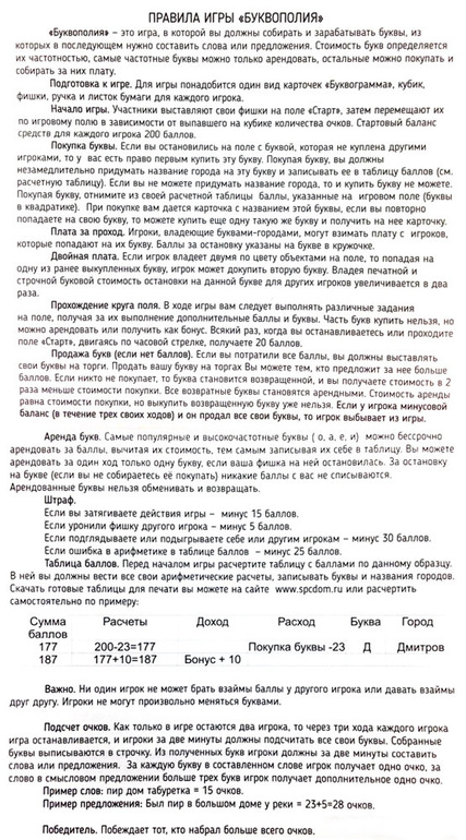 «Буквополия» (2-6 игроков) возраст 7+. Цель игры - завладеть наибольшим количеством букв из этих букв постараться сложить слова или предложения тот, кто составит больше слов, становиться победителем. Буквы игрок собирает, выполняя различные задания, арендуя или покупая эти буквы, перемещаясь по игровому полю. Стоимость букв определяет их частотность.