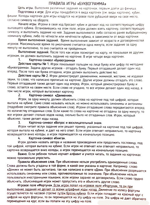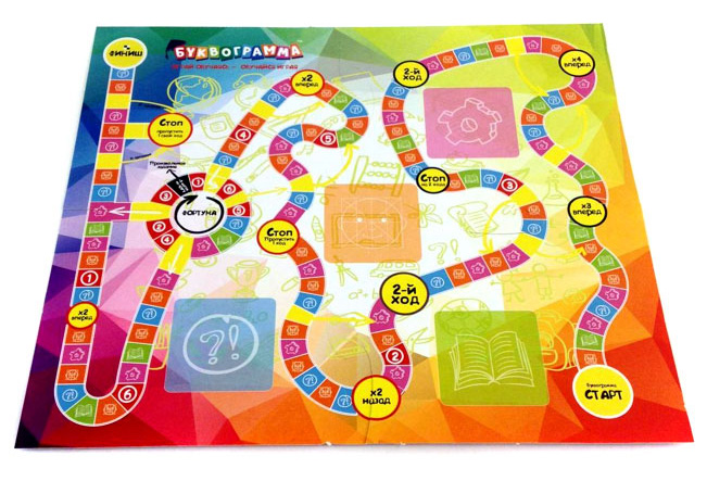 «Буквограмма» (2-6 игроков) возраст 3+. Цель игры пройти быстрее всех до финиша, объясняя слова, показывая силуэты букв и цифр, вспоминая авторов произведений и продолжение пословиц, решая логические и арифметические задачи.