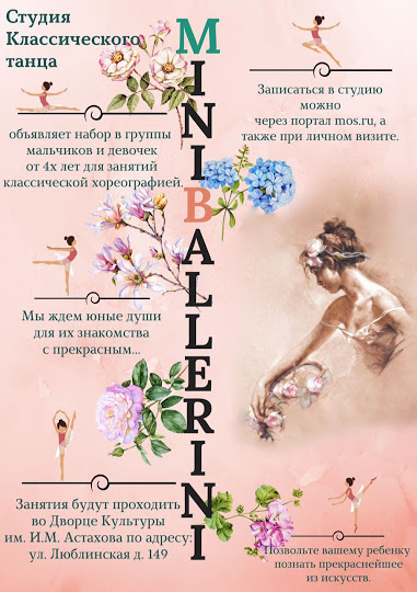 Счастливая в Развитие и обучение детей от трех до шести лет 9 лет Набирается группа для занятий классическим балетом. Кружки Все подробности можно узнать по телефону 8495 351 59 84 http://dkastahova.ru/ Посмотрите еще 20 записей на эту тему Отменить Ответить Вопрос о вокале. Соскольки лет начинать учить английский язык? Чаты Беременных Выберите чат: Январята-2026 Февралята-2026 Мартята-2026 Апрелята-2026 Майчата-2026 Июнята-2026 Июлята-2026 Августята-2026