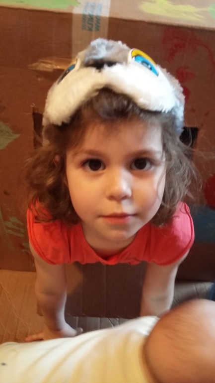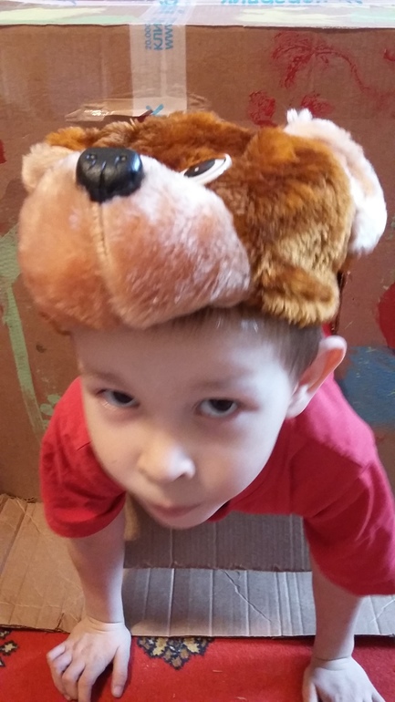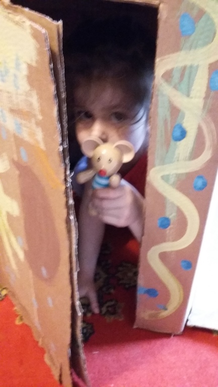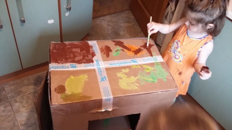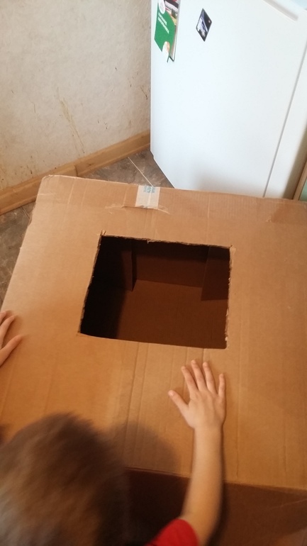 Для этого нам понадобится большая картонная коробка. Где мама сделала окошки и дверку.
