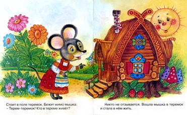 С ней мы начали знакомство с тоненькой книжечки. Понравились яркие большие иллюстрации и понятный для ребенка ( даже для годовасика) текст. Вот такая книжечка от издательства Фламинго. Обратите внимание, что мишка он улыбается и он сломал теремок нечаянно и потом обязательно поможет построить новый для всех зверят, чтобы жить дружно и помогать друг другу. Сейчас сынуле уже 4.5 годика, а книжка нежно любима и таких тоненьких книжек у нас все прибавляется