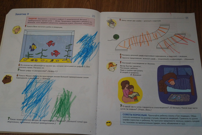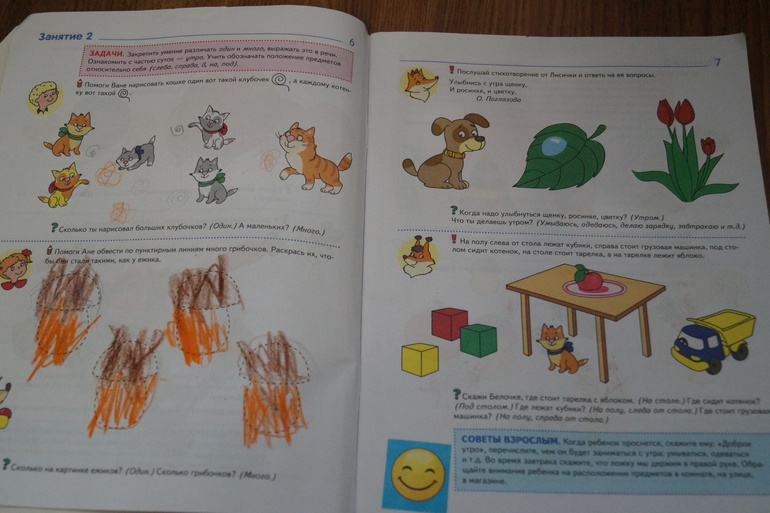 Это довольно таки объемное пособие, с достаточно плотными листами, с яркими красочными картинками, задания разнообразныепомима счета и изучения цифт, много заданий на графоматорику - обвести, раскрасить, провести линии, задания по развитию речи, памяти и внимания. Также сдесь дается много рекомендаций для родителей, какие вопросы задать, на что обратить внимание ребенка и др.Вообщем очень хорошое пособие, позже, я его еще раз буду покупать, так как это мы уже почти прошли.Другие пособия по математике.