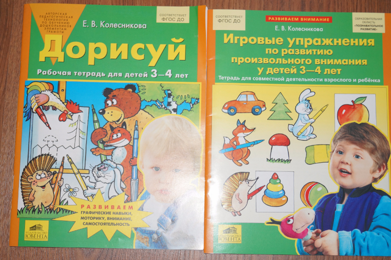 Еще пособия Е.В. Колесниковой Игровые упражнения по развитию произвольного внимания у детей 3-4 лет и Дорисуй. Рабочая тетрадь для детей 3-4 лет.