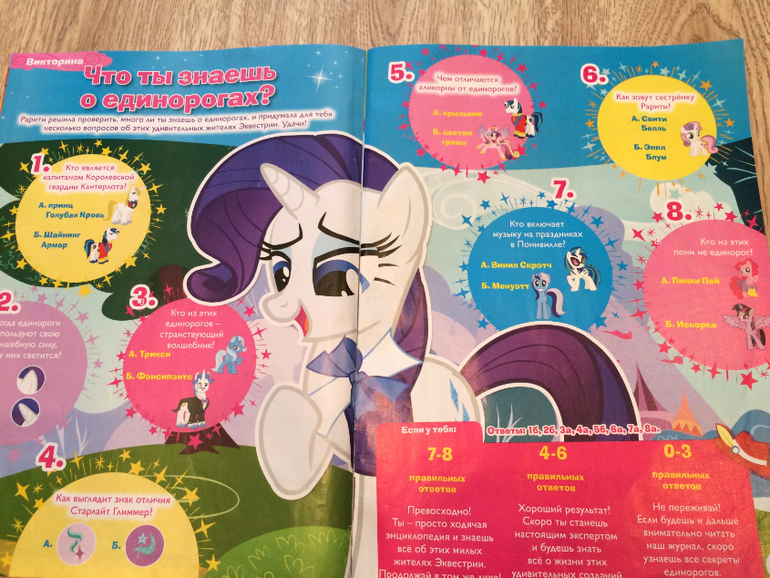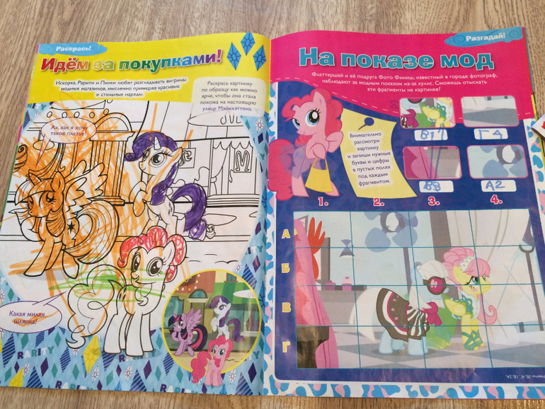 Каждый номер посвящен разной теме - августовский - празднику цветов в Понивилле ,к которому готовятся все лошадки, шьют платья, встречают жюри конкурса и решают некоторые трудности. Все это представлено - комиксами, головоломками ,раскрасками и можно даже создать 3D инсталляцию бутика Рарити!